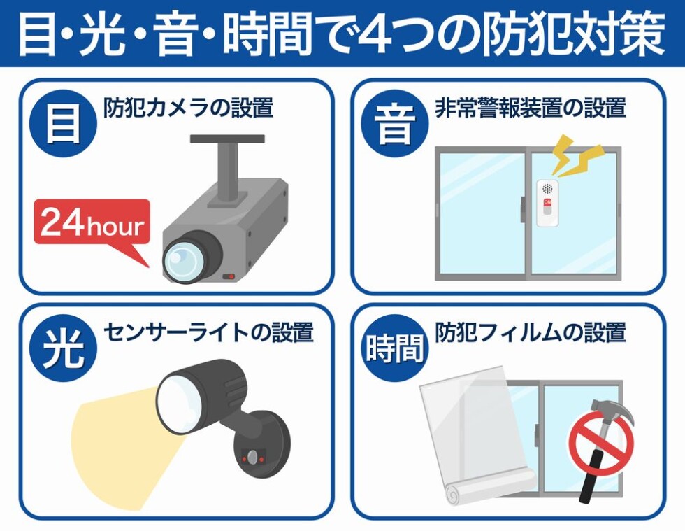 防犯対策には犯罪防止4原則(時間、目、光、音)を意識して取り組みましょう。